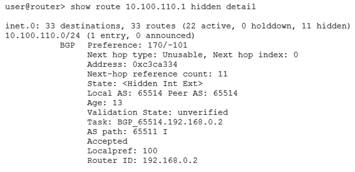 Referring to the exhibit, why is the route hidden?