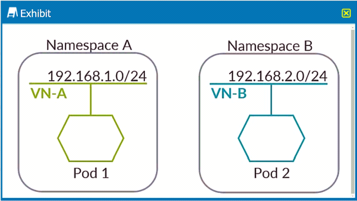 Your company uses Kubernetes as an orchestrator integrated with Contrail. You are asked to create the networks shown in the exhibit and enable communication between Pod 1 and Pod 2.