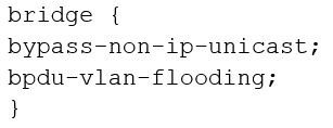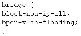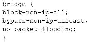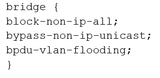 You are configuring transparent mode on an SRX Series device. You must permit IP-based traffic only, and BPDUs must be restricted to the VLANs from which they originate.