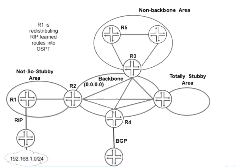 Referring to the exhibit, which LSA type is used to advertise 192.168.1.0/24 to R5?