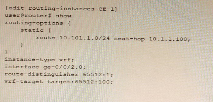 The auto-export parameter is a routing option that allows a routing instance to share routes with other routing instances or the master routing table. The auto-export parameter automatically exports routes from one routing instance to another based on the route target communities attached to the routes. In this scenario, the 10.101.1.0/24 route will be shared if the auto-export parameter is configured under [edit routing-options] hierarchy level.