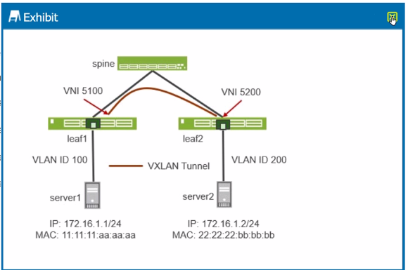 Each VXLAN network is identified by a unique VXLAN Network Identifier (VNI). In this exhibit, we have two VNIs, 5100 and 5200, assigned to the VXLAN tunnels between leaf1 and leaf2.