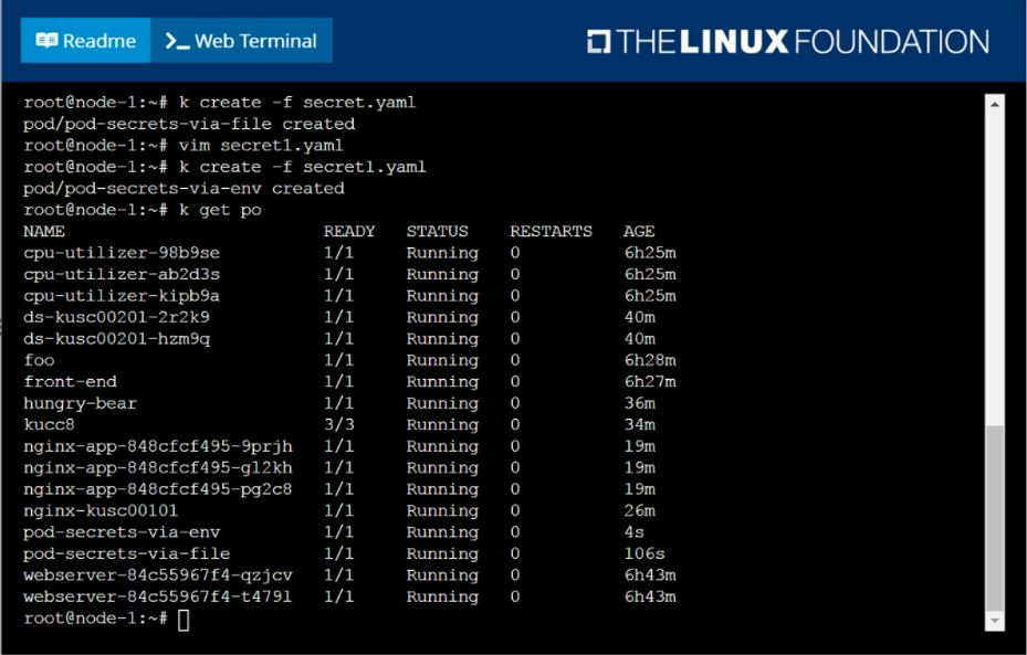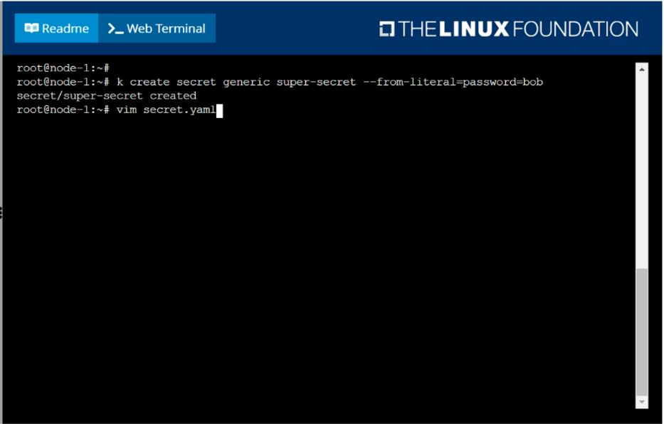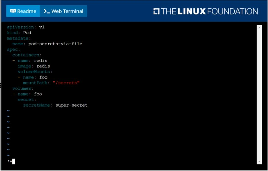 Create a pod named pod-secrets-via-file, using the redis Image, which mounts a secret named super-secret at /secrets.