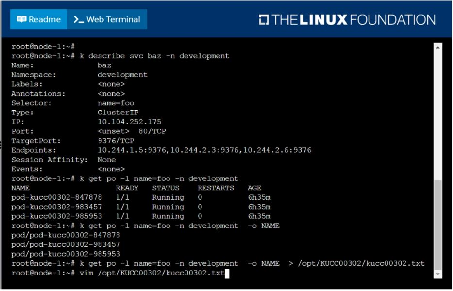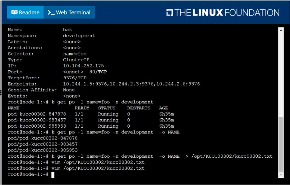 /opt/KUCC00302/kucc00302.txt that lists all pods that implement service baz in namespace development.