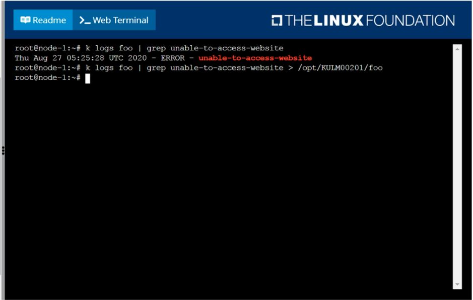 kubectl logs foo | grep 'unable-to-access-website' > /opt/KULM00201/foo