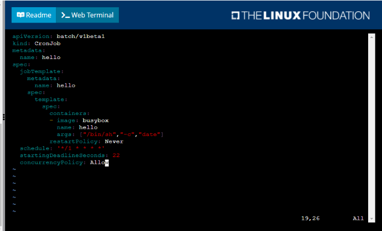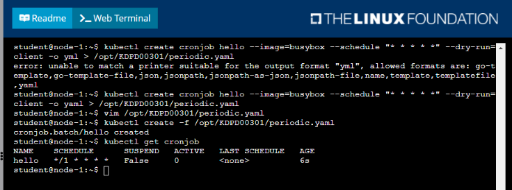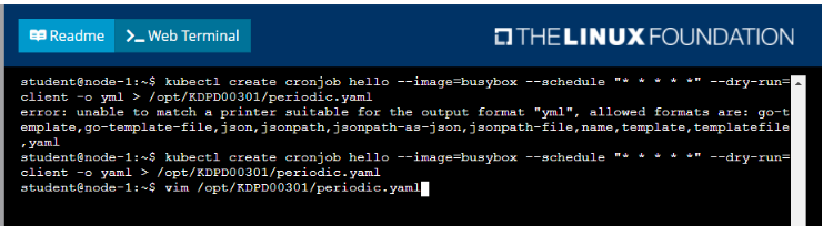 * Create a YAML formatted Kubernetes manifest /opt/KDPD00301/periodic.yaml that runs the following shell command: date in a single busybox container. The command should run every minute and must complete within 22 seconds or be terminated oy Kubernetes. The Cronjob namp and container name should both be hello
