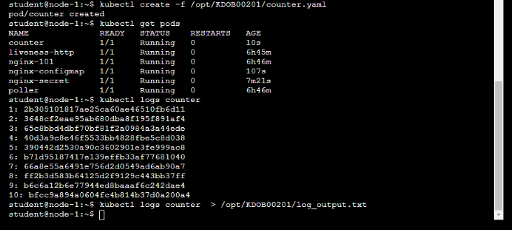 * Deploy the counter pod to the cluster using the provided YAMLspec file at /opt/KDOB00201/counter.yaml