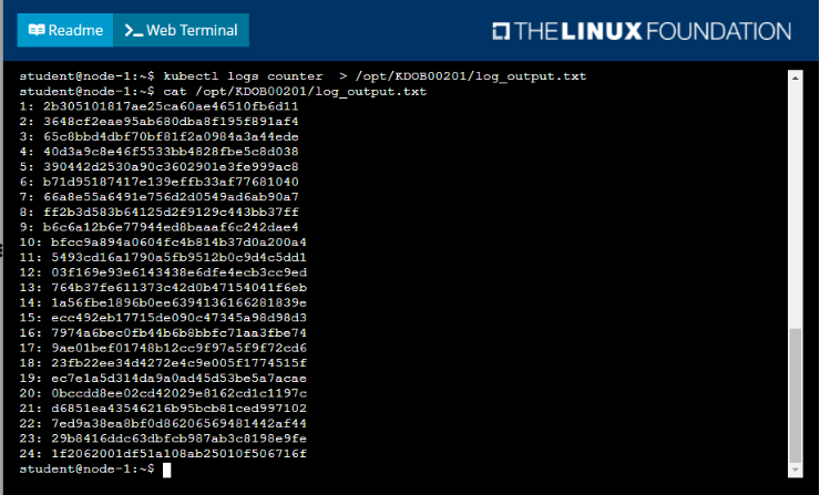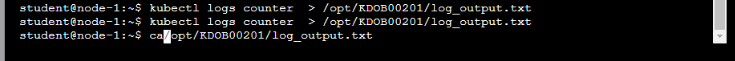 * Retrieve all currently available application logs from the running pod and store them in the file /opt/KDOB0020l/log_Output.txt, which has already been created