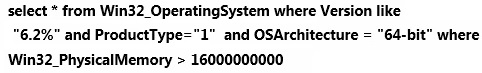 SELECT version FROM Win32_OperatingSystem WHERE Version LIKE '6.3%' and ProductType = '1' AND OSArchitecture = '64-bit'