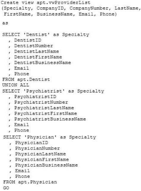 You have three tables that contain data for dentists, psychiatrists, and physicians. You create a view that is used to look up their email addresses and phone numbers.