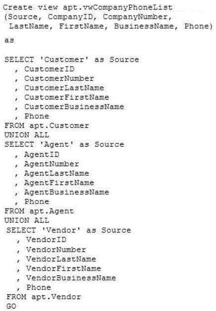 You have three tables that contain data for vendors, customers, and agents. You create a view that is used to look up telephone numbers for these companies.