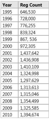 You are developing a SQL Server Reporting Services (SSRS) report. The report includes a dataset with fields named Year, MonthNumber, and RegCount. The report includes a table that displays the number of recorded registration occurrences per year, as shown in the following table.