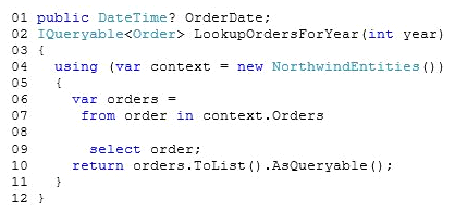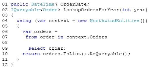 You are developing an application that uses the Microsoft ADO.NET Entity Framework to retrieve order information from a Microsoft SQL Server database. The application includes the following code. (Line numbers are included for reference only.)