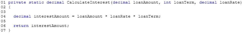 You are debugging an application that calculates loan interest. The application includes the following code. (Line numbers are included for reference only.)