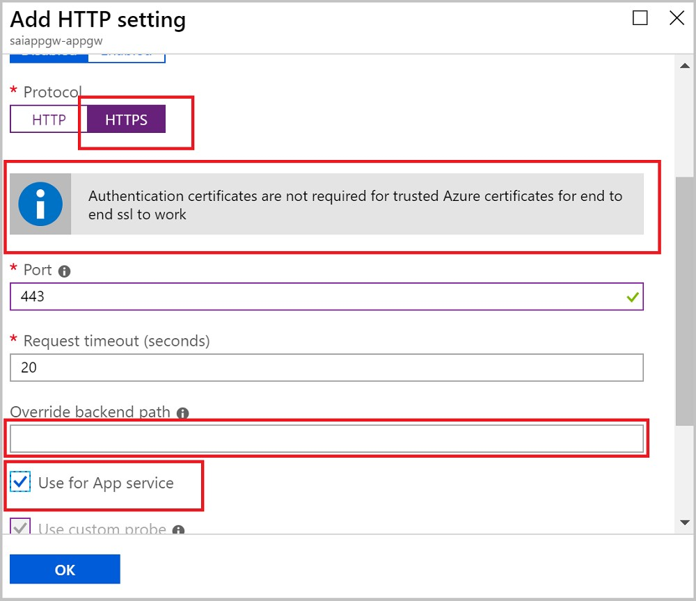 In case of end to end SSL, trusted Azure services such as Azure App service web apps do not require whitelisting the backends in the application gateway. Therefore, there is no need to add any authentication certificates.