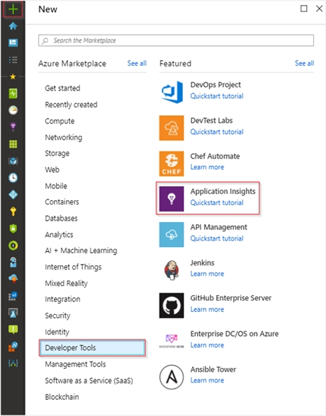 2. Log into your Azure account, Select Create a resource > Developer tools > Application Insights.