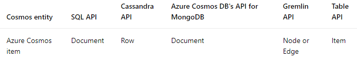 Depending on the choice of the API, an Azure Cosmos item can represent either a document in a collection, a row in a table or a node/edge in a graph. The following table shows the mapping between API-specific entities to an Azure Cosmos item: