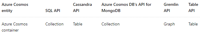 An Azure Cosmos container is specialized into API-specific entities as follows:
