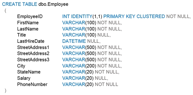 A data engineer creates a table to store employee information for a new application. All employee names are in the US English alphabet. All addresses are locations in the United States. The data engineer uses the following statement to create the table.