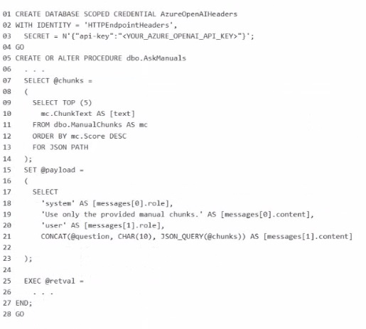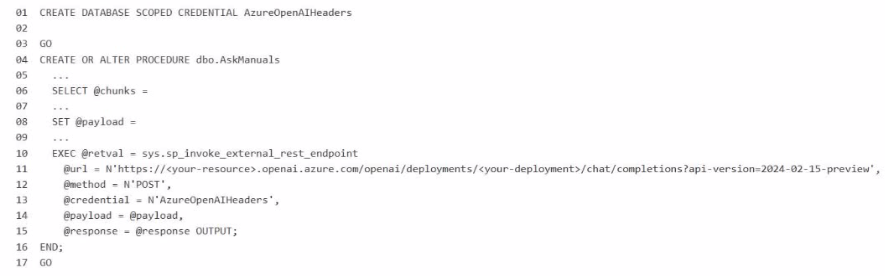 The correct answer is Option B because the requirement is to call an Azure OpenAI REST endpoint from SQL Server 2025 while providing the highest level of security, and the instance already has a managed identity enabled. For Microsoft's SQL AI features, the preferred secure pattern is to use a database scoped credential with IDENTITY = 'Managed Identity' instead of storing an API key. Microsoft documents that SQL Server 2025 supports managed identity for external AI endpoints, and for Azure OpenAI the credential secret uses the Cognitive Services resource identifier: {'resourceid':'https://cognitiveservices.azure.com'}.