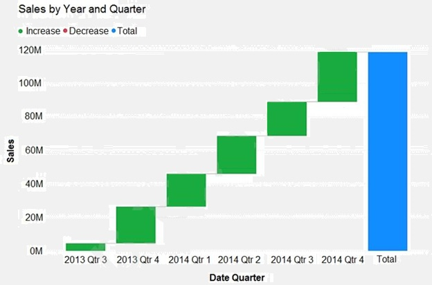 You need to create a visualization of running sales totals per quarter as shown in the following exhibit.