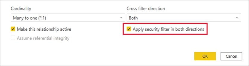By default, row-level security filtering uses single-directional filters, whether the relationships are set to single direction or bi-directional. You can manually enable bi-directional cross-filtering with row-level security by selecting the relationship and checking the Apply security filter in both directions checkbox. Select this option when you've also implemented dynamic row-level security at the server level, where row-level security is based on username or login ID.