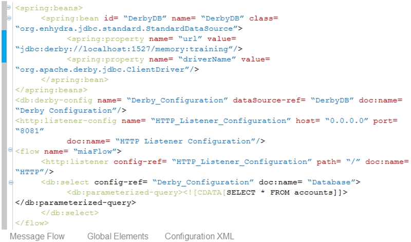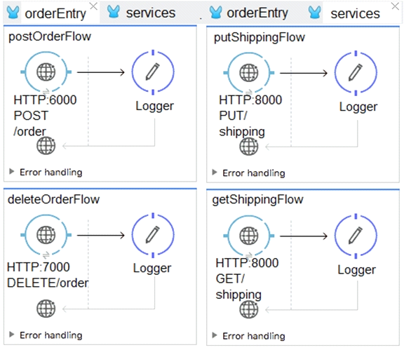 Refer to the exhibits. The two Mule configuration files belong to the same Mule project. Each HTTP Listener is configured with the same host string and the port number, path, and operation values are shown in the display names.