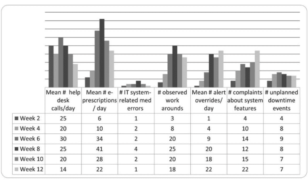 Since the chart is not provided, I'll base the answer on typical CPHQ scenarios for EHR implementation. The options suggest the chart includes data on e-prescribing stability, system-related medication errors, help desk calls, downtime events, overrides, workarounds, and complaints. Option D, ''Overrides, workarounds, and complaints indicate there are underlying barriers to use,'' aligns with a common finding in EHR post-implementation reviews. Overrides (e.g., bypassing alerts), workarounds (e.g., using paper notes instead of the EHR), and complaints typically signal usability issues, such as a poorly designed interface, inadequate training, or system inefficiencies. These barriers can lead to errors, staff frustration, and reduced patient safety, requiring targeted interventions like workflow redesign or additional support.