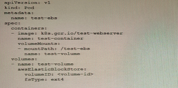 You are reviewing a Kubernetes manifest to deploy an Amazon Elastic Block Store (AWS EBS).