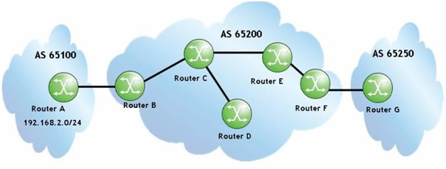 Routers C and E are route reflectors. When the update for prefix 192.168.2.0/24 is received at router F, what will be the Originator_ID attribute?