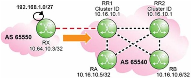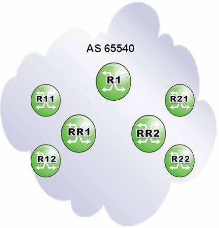 Routers RR1 and RR2are route reflectors with clients R1x and R2x, respectively. Routers RR1 and RR2 are non-clients of each other, and router R1 is a non-client of both. Which of the following regarding BGP sessions in AS 65540 is TRUE?