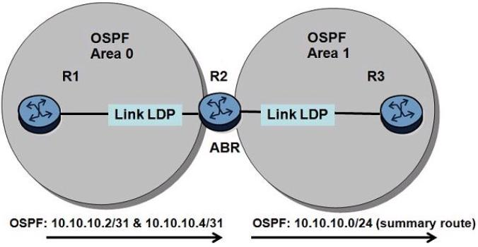 Router R2 advertises the aggregate prefix 10.10.10.0/24 into Area 1. Why would LDP aggregate-prefix-match be enabled on router R3?