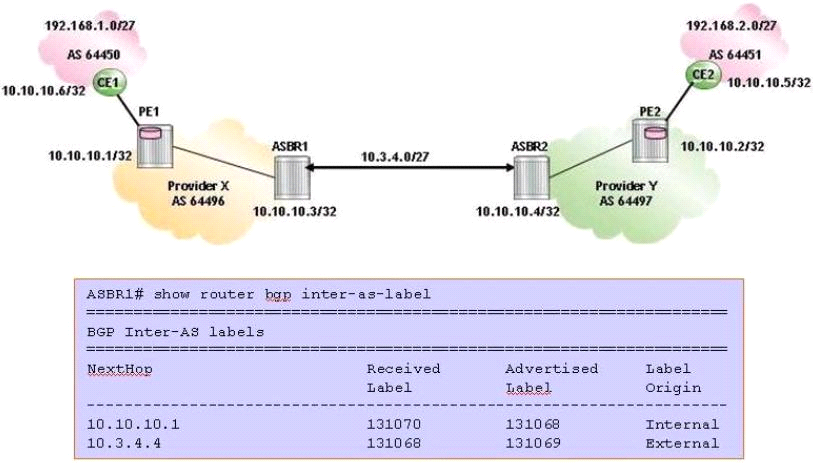 For the Inter-AS model B VPRN, which of the following about the inter-as-label output on ASBR1 is TRUE?