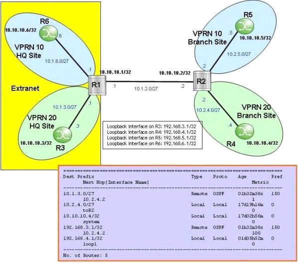 Router R4 is an Nokia 7750 SR configured for the extranet VPRN network. Which CLI command is executed on router R4 to produce the displayed output?