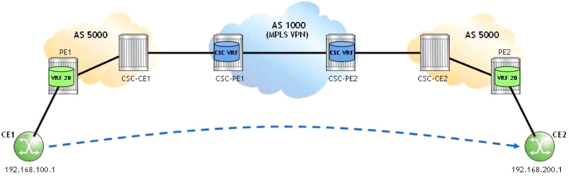 A Carrier Supporting Carrier (CSC) VPRN is configured for a customer carrier who is a BGP/MPLS service provider. If CE1 sends an IP packet to 192.168.200.1, which of the following is FALSE?
