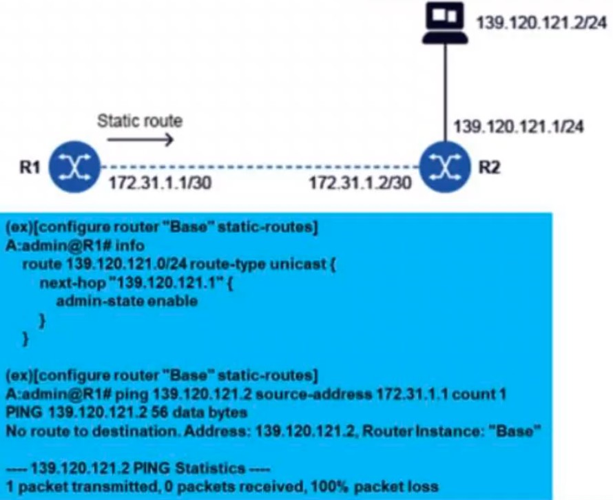 A static route has been configured on router R1 to reach the PC at 139.120.121.2.