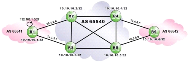 AS 65540 routers are iBGP fully-meshed. Assume routers R4, R5 and R6 are configured with addpaths ipv4 send 2 receive". Which routes to 192.168.0.1/27 is router R6 expected to have in its BGP routing table?