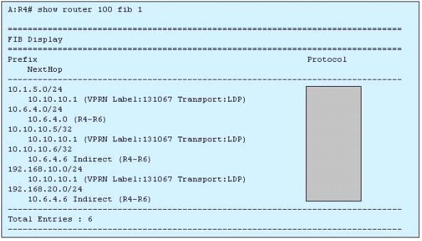 The output is from PE router R4 about VPRN service 100. How many prefixes have been learned from the MP-BGP protocol?