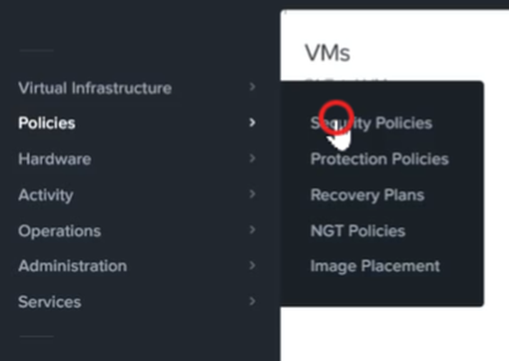 Log in to Prism Central and go to Network > Security Policies > Create Security Policy. Enter Staging_Production as the name of the security policy and select Cluster A as the cluster.