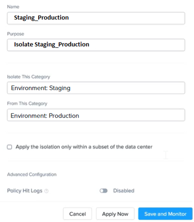 This will create a security policy that will block any traffic between the VMs in the Staging Environment and the VMs in the Production Environment. You can verify that the security policy is working by trying to ping or access any VM in the Production Environment from any VM in the Staging Environment, or vice vers