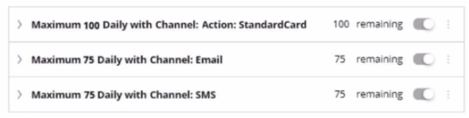 The outbound run delivers 75 emails and 25 SMSes for the Standard card offer because the volume constraint is set to limit the number of actions per channel per day. The email channel has a limit of 75 actions per day, so all 75 email offers are delivered. The SMS channel has a limit of 25 actions per day, so only 25 SMS offers are delivered. The remaining 50 SMS offers are not delivered because they exceed the volume constraint.