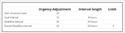 The service level provides a four-hour initial delay. If the case urgency is set to 10 and the case reatches the assignment at 9 A.M. Monday, what is the assignmenturgency at noon Wednesday ?