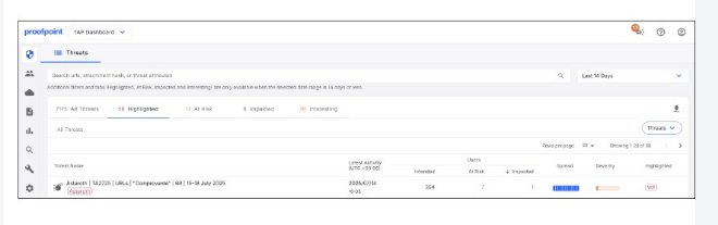 TAP dashboard widgets and threat cards commonly provide the ''funnel'' metrics and interaction telemetry needed for rapid scoping. From the exhibit, you can directly determine that seven users received the threat message (C) and that one user clicked on a rewritten URL (E). These are concrete, environment-specific facts derived from recipient exposure and click tracking through URL Defense rewriting. Claims like ''seen by all Proofpoint customers'' (A) are global intelligence statements and are not typically provable from a single customer's threat card unless explicitly shown. VIP status (B) cannot be asserted as ''definitely'' unless the UI explicitly flags VIP for that impacted user. ''354 users at risk'' (D) may be a different metric in some views, but the question's exhibit-driven determinations are the ones unambiguously shown: recipients count and rewritten click count. In Proofpoint IR triage, these two determinations immediately guide response: (1) scope the recipient list for remediation (TRAP pull, user notifications), and (2) prioritize the clicker for compromise checks (credential reset, token revocation, mailbox rule audit), because clicks convert exposure into potential incident impact.