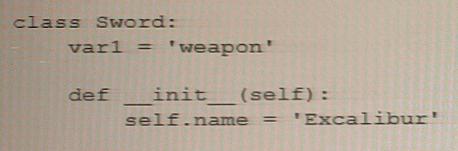 The correct answer isC. Excalibur is the value passed to an instance variable. In the given code snippet,self.nameis an instance variable of theSwordclass. When an instance of theSwordclass is created withvarl = Sword('Excalibur'), the value'Excalibur'is passed as an argument to the__init__method and assigned to thenameinstance variable of thevarlobject.