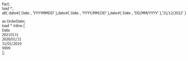 In the script provided, the alt() function is used to handle various date formats. The alt() function in Qlik Sense evaluates a list of expressions and returns the first valid expression. If none of the expressions are valid, it returns the last argument provided (in this case, '31/12/2022').
