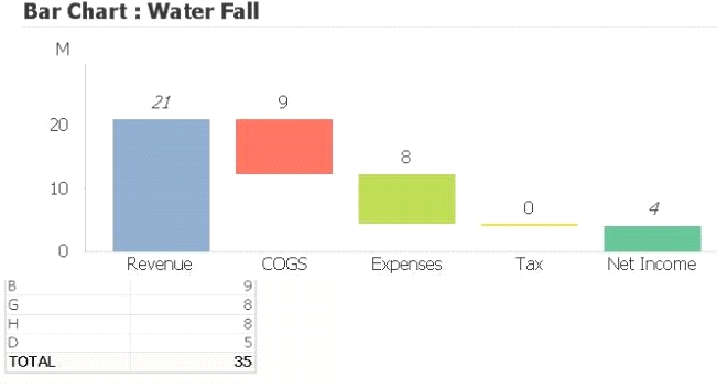 A business analyst creates a water fall chart to understand how an initial value is affected by a series of intermediate positive and negative values.