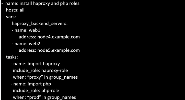 Create a file called requirements.yml in /home/sandy/ansible/roles a file called role.yml in /home/sandy/ansible/. The haproxy-role should be used on the proxy host. And when you curl http://node3.example.com it should display "Welcome to node4.example.com" and when you curl again "Welcome to node5.example.com" The php-role should be used on the prod host.