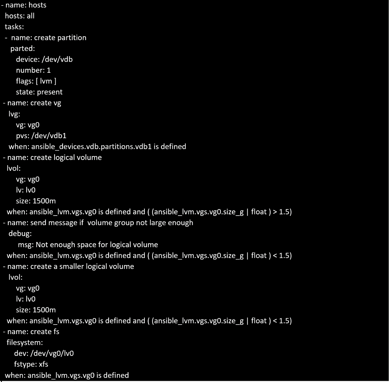 In /home/sandy/ansible/ create a playbook called logvol.yml. In the play create a logical volume called Iv0 and make it of size 1500MiB on volume group vgO If there is not enough space in the volume group print a message "Not enough space for logical volume" and then make a 800MiB Iv0 instead. If the volume group still doesn't exist, create a message "Volume group doesn't exist" Create an xfs filesystem on all Iv0 logical volumes. Don't mount the logical volume.