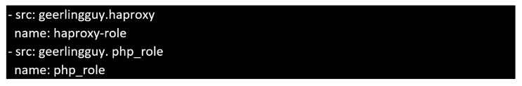 Create a file called requirements.yml in /home/sandy/ansible/roles to install two roles. The source for the first role is geerlingguy.haproxy and geerlingguy.php. Name the first haproxy-role and the second php-role. The roles should be installed in /home/sandy/ansible/roles.