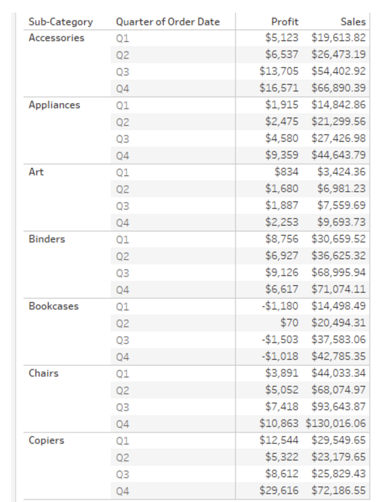 Waterfall Chart: This chart type is excellent for visualizing the sequential growth or decline of profits across different quarters for each sub-category. It clearly shows how profits accumulate over time, highlighting both positive and negative changes, which makes it ideal for tracking profit growth or decline through the quarters.